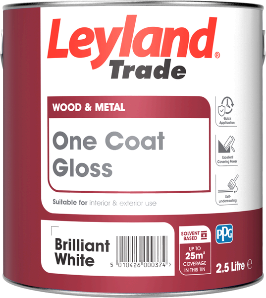 Leyland Trade One Coat Gloss is an easy to use, self-undercoating gloss paint. Its high opacity means that only one coat is necessary under most conditions. It dries to a tough, hardwearing gloss finish on interior and exterior wood and metalwork.